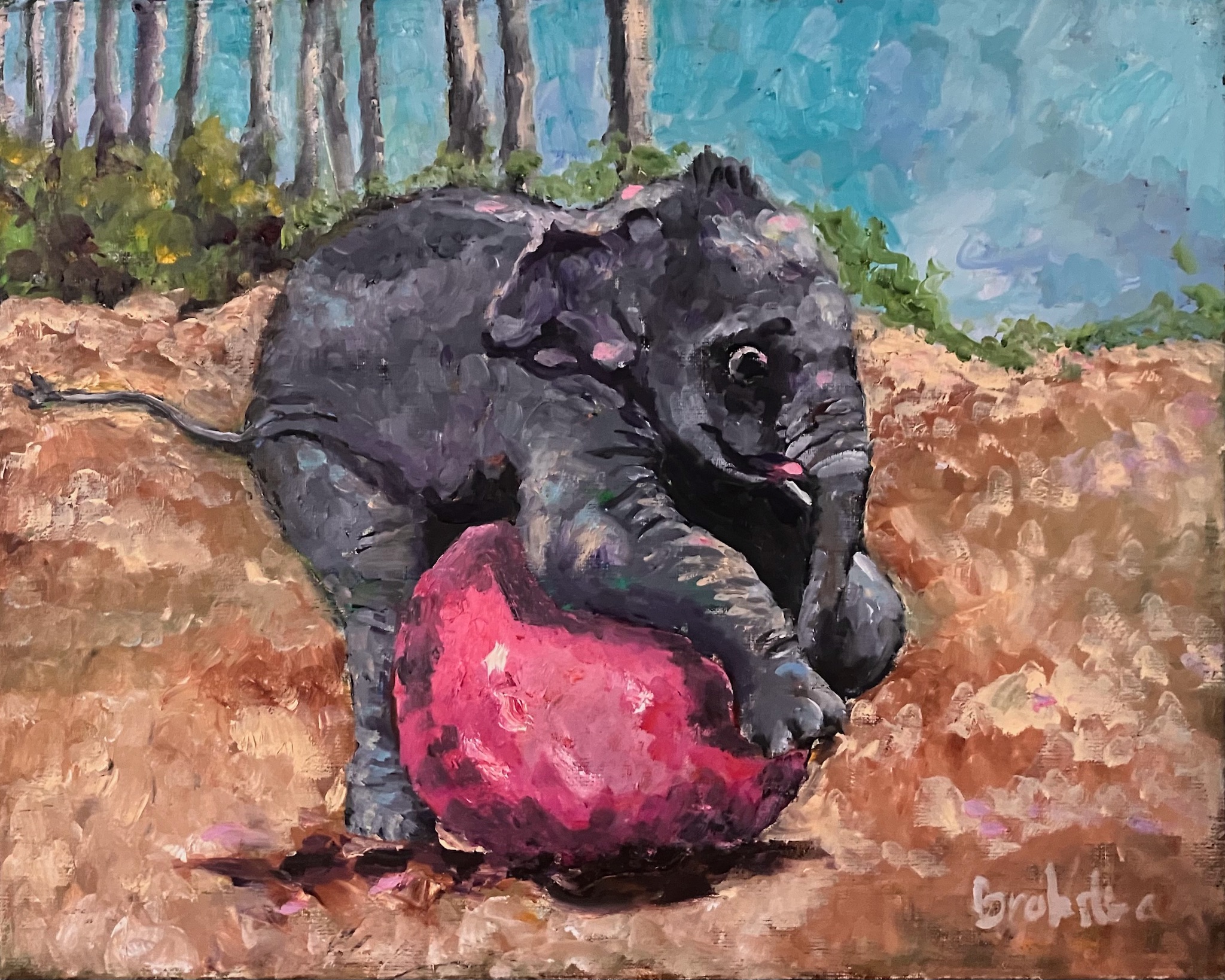 Babyolifant speelt met zijn ball /Baby elephant playing with its ball. Olieverf op linnen/Oil on canvas, 30 x 40 – 2016