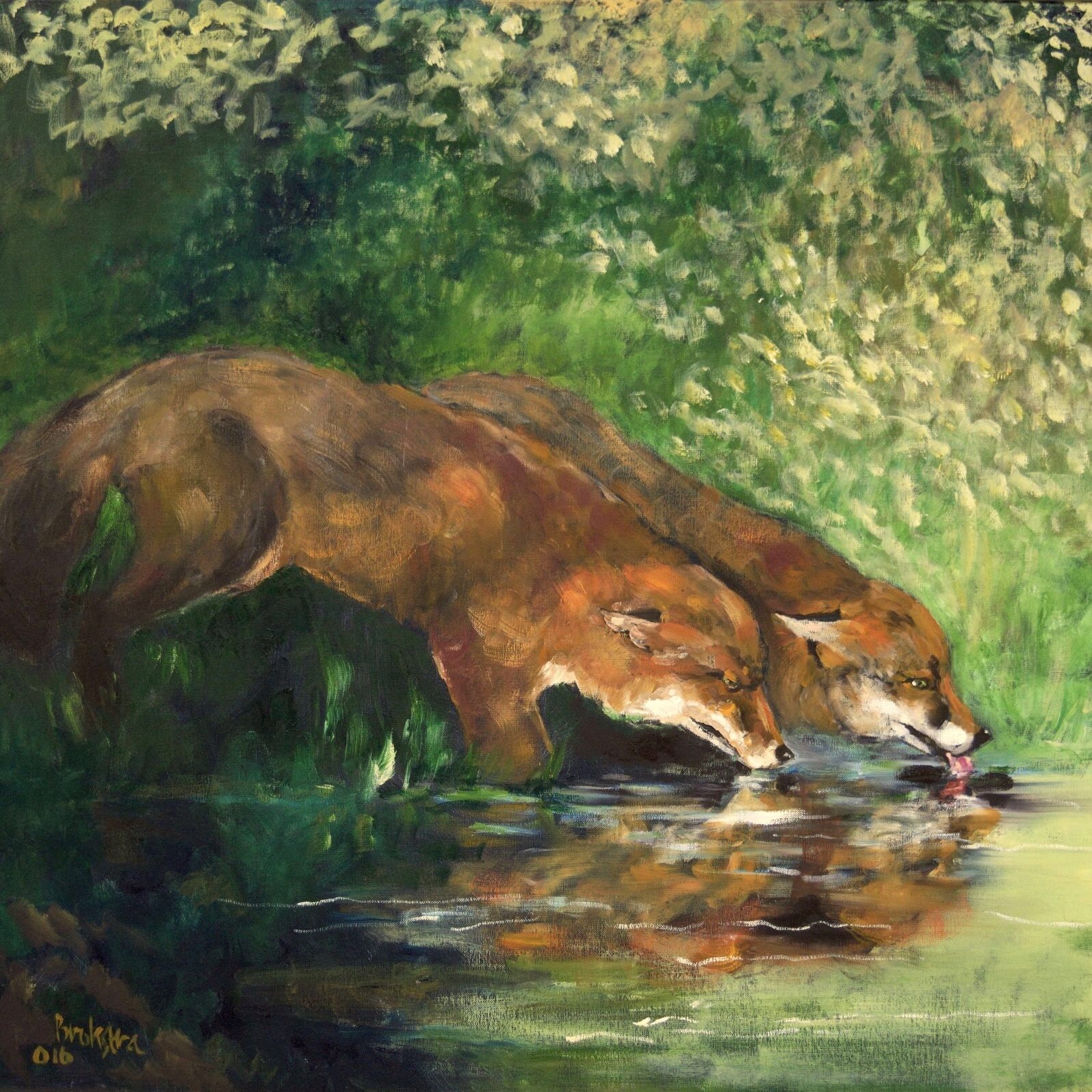 Twee drinkende vossen/Two foxes drinking. Olieverf op linnen/Oil on canvas, 70 x 80 – 2001